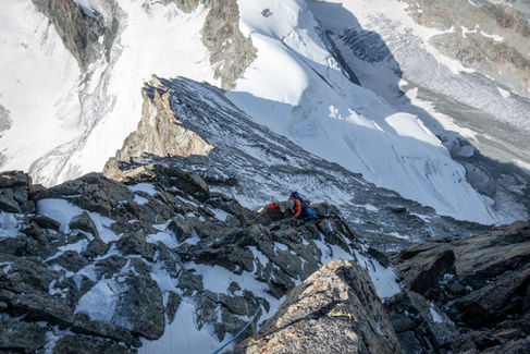 Am nächsten morgen geht es zeitig los und wir starten in Richtung Arbengrat. Der Grat selbst bietet wunderbare Kletterei und einen traumhaften Sonnenaufgang. Am Gipfel angelangt ist unsere Tour jedoch noch lange nicht zu Ende. Wir seilen uns vom Obergabelhorn ab und erreichen über einen steilen Firngrat sowie einen weiteren Felsturm die Wellenkuppe. Von dieser wieder kombiniert durch Schnee, Fels und abschließend einen steilen Gletscher hinunter in Richtung Rothornhütte.