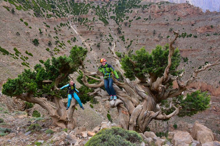 Leider nicht vollenden konnten wir die Route „Canyon Apache“, wo uns am Tag darauf erneut ein Gewitter 2 SL vor dem Ausstieg zum Abseilen zwang. Auch diese Tour war ein tolles Erlebnis, das schon beim Zustieg durch einen engen Canyon begann. Nach unseren Klettertouren blieb am Abend immer noch genügend Zeit um mit den anderen Kletterern aus aller Welt zu plaudern, oder einen kurzen Abstecher ins Dorf zu machen, zum Beispiel um Tabak zu kaufen. Das gestaltete sich allerdings schwieriger als erwartet, da die beiden kleinen Läden im Dorf keinen anzubieten hatten. Schließlich führten uns zwei einheimische Kinder zu einem abgelegenen Haus am Dorfrand wo uns eine ältere Frau 2 Packungen Zigaretten verkaufte, die sprachlichen Barrieren wurden mit Händen und Füßen überbrückt. Überhaupt kann man sich das Leben der Menschen in Taghia bei uns kaum noch vorstellen. Alle Felder werden von Hand mit Sicheln geerntet, die Kornbündel auf Eseln ins Dorf getragen und dort vor den Häusern zum Trocknen ausgelegt. Die Kinder laufen mit alten Holztafeln zur Schule und als Spielzeug reichen ihnen Steine und Stöcke. Manche der Kinder fragen anstelle von Süßigkeiten um einen Stilo, also einen Kugelschreiber zum malen, aber alle haben immer ein Lächeln im Gesicht und wirken glücklich. Auch als Gast in diesem Dorf passt man sich schnell an das einfache Leben an, und man genießt die Zeit ohne Smartphone (Handyempfang gibt es sowieso nicht), TV und sinnlosem Stress. Man sitzt gemütlich um eine Kanne Pfefferminztee und hat jede Menge Zeit zu plaudern.